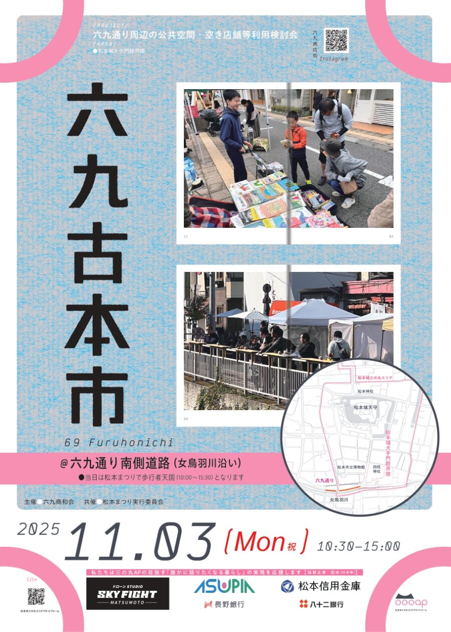 歩行者天国になった女鳥羽川沿いの道路をゆったり歩いて、古本や雑貨を楽しもう。
