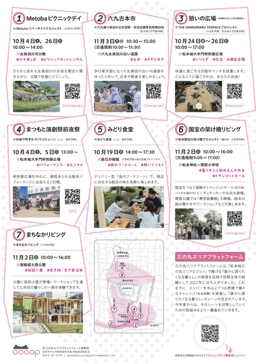 お問い合わせ先 | 三の丸エリアプラットフォーム事務局 松本市中心市街地活性本部 市街地活性担当 0263-3276 sannomaru.areaplatform@gmail.com |